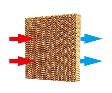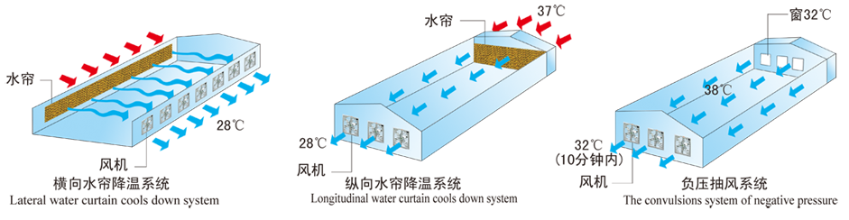 在現(xiàn)代畜牧業(yè)通風(fēng)技術(shù)中,濕簾和風(fēng)機(jī)搭配的縱向通風(fēng)降溫組合是經(jīng)濟(jì)有效的降溫通風(fēng)措施,濕簾的波紋纖維紙表面有一層水膜,室外干熱空氣通過負(fù)壓風(fēng)機(jī)的抽吸作用穿過濕簾,水膜吸收空氣中的熱量,經(jīng)處理過的涼爽空氣進(jìn)入室內(nèi),同時將室內(nèi)的污濁空氣排出去。
