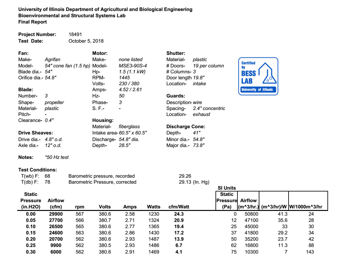 靜壓0.1英寸水柱下的風(fēng)量是極其重要的,因?yàn)樗切笄萆岘h(huán)境下風(fēng)機(jī)的運(yùn)行環(huán)境壓力。風(fēng)機(jī)的性能數(shù)據(jù)通常是靜壓0水柱,但在實(shí)際運(yùn)用過程中很少用到。作為通風(fēng)設(shè)計(jì)標(biāo)準(zhǔn),養(yǎng)豬手冊和養(yǎng)牛手冊提供了在寒冷、溫和和炎熱氣侯下的通風(fēng)比率。選持合適的風(fēng)機(jī)才能滿足這些需求。